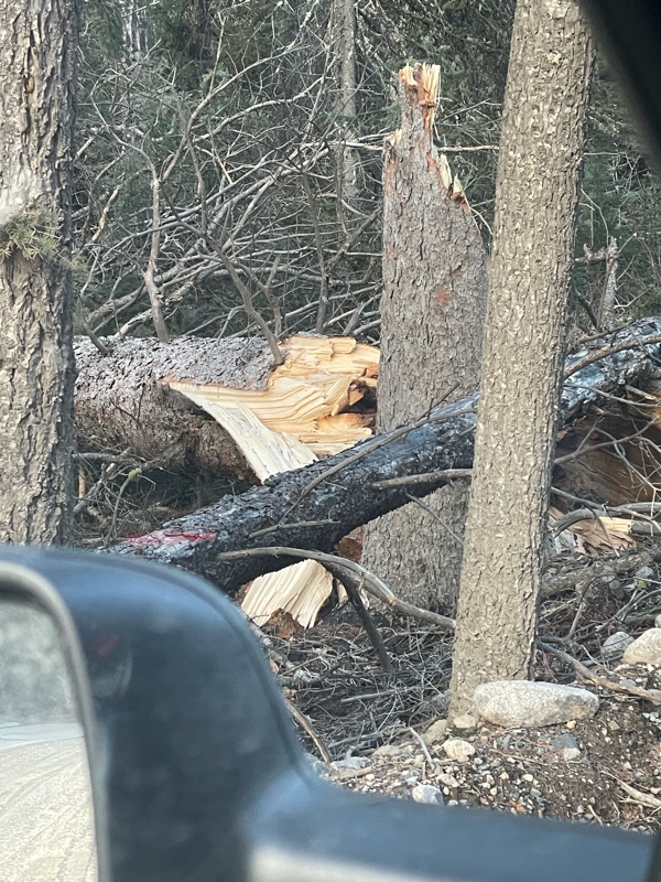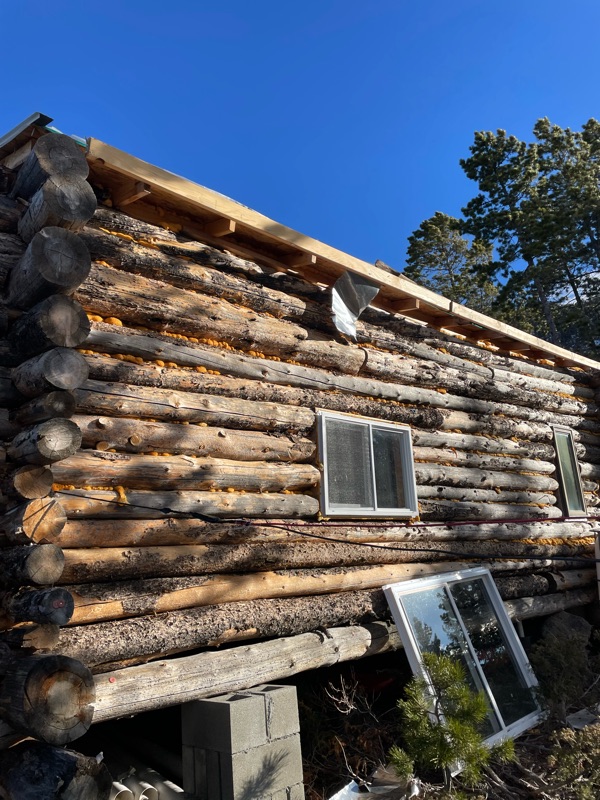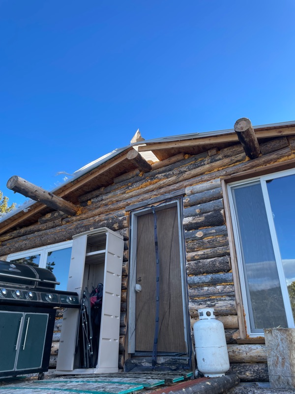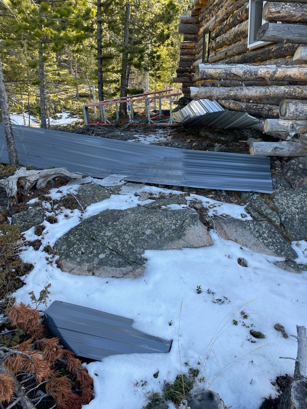 Mother Nature was naughty while I was in Ecuador. Blew down several trees and ripped three roofing panels off. Cabin was still dry. I built some redundancy into the roof.